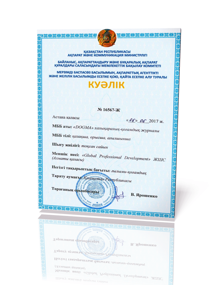 Журнал зарегистрирован Комитетом государственного контроля в области связи, информатизации и средств массовой информации Министерства информации и коммуникации Республики Казахстан, свидетельство № 16567-Ж от 06.06.2017 года.